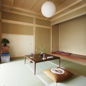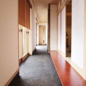 玄関を開けると土間が広がっていて、特にその黒と赤みの強い木材とのコントラストが非常に印象的です。和室を囲うように伸びており、室内と前栽を緩やかに繋いでいます。柱や梁などの木材をあえて見せるデザインや雨戸にも木を使うなど、細かいところまでこだわっています。