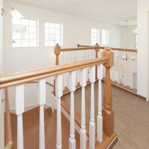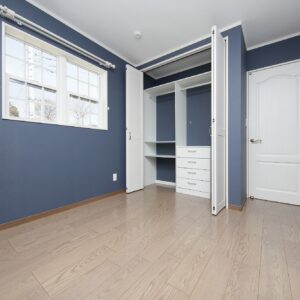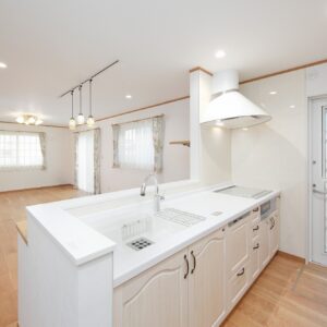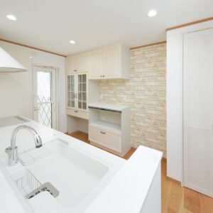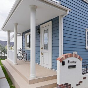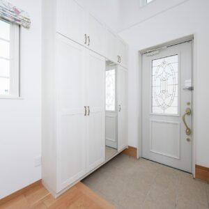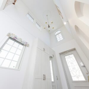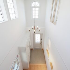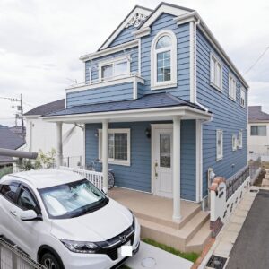 爽やかさが目を引くBLUEの外壁とWHITEに統一された柱や建具が特に印象的です。玄関先へはタイルデッキを設け、外構へはレンガのアクセントを加えることでよりアメリカナイズを図りました。内装にもしっかりとこだわりがあり、シャンデリアや引き出しの取っ手、カーテンレール等の様々な部分をお施主様がセレクトしています。また、吹き抜け窓や玄関ニッチ、レンジフードなどにアールを加えることで細かいところからも雰囲気づくりを行っています。